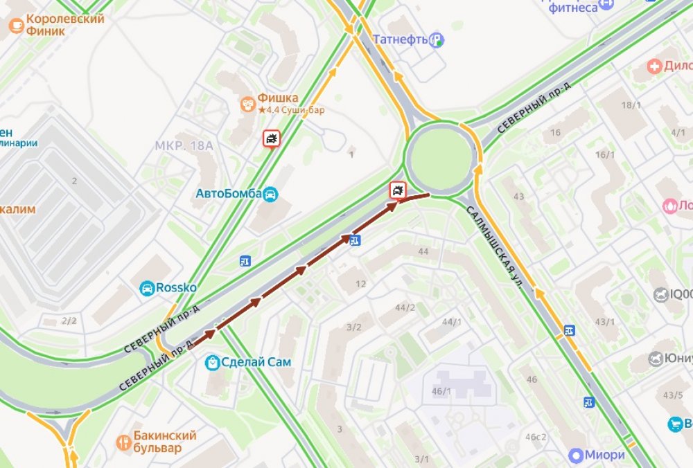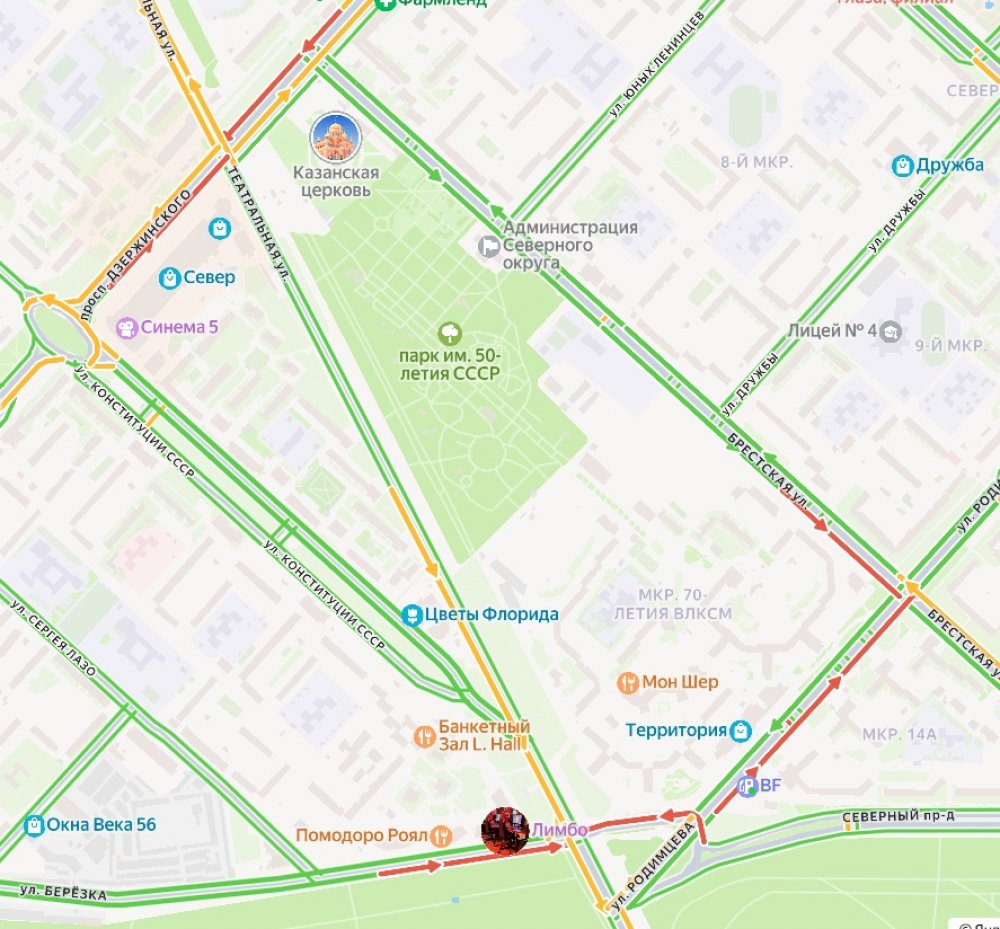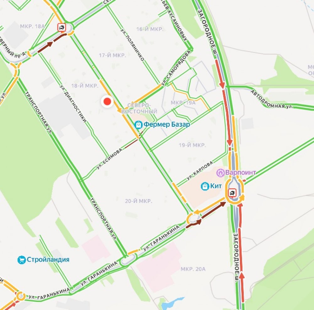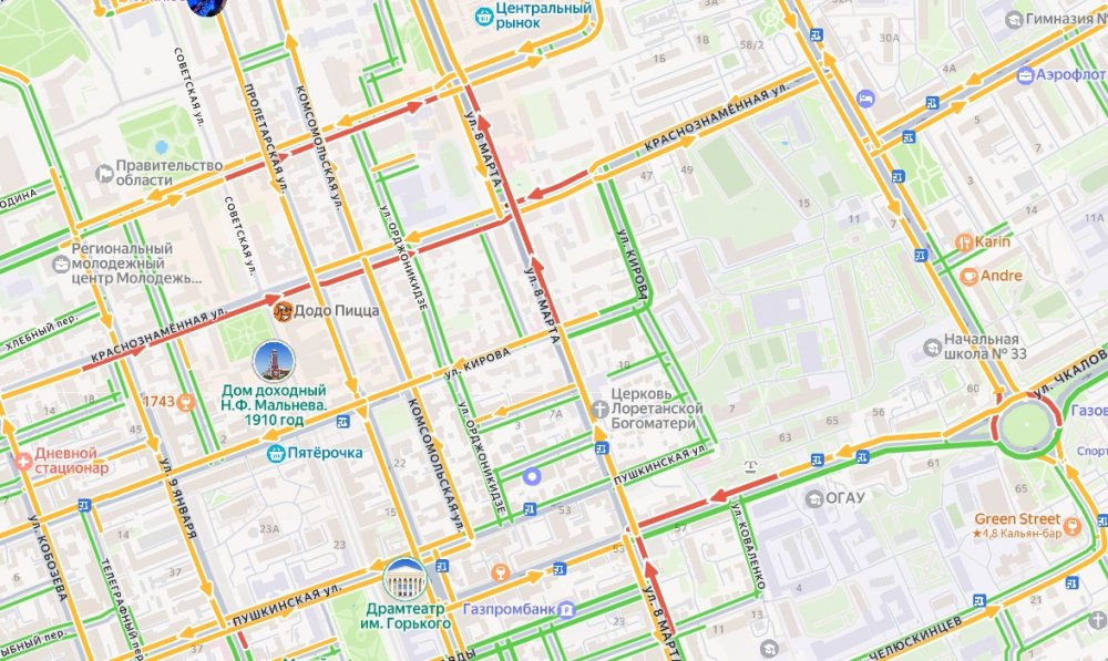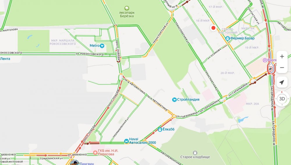 По данным сервиса Яндекс.Карты, традиционные заторы наблюдаются на проспекте Победы (от пересечения с ул. Шевченко до пр. Автоматики и на кольце  у ул. Рокоссовского).