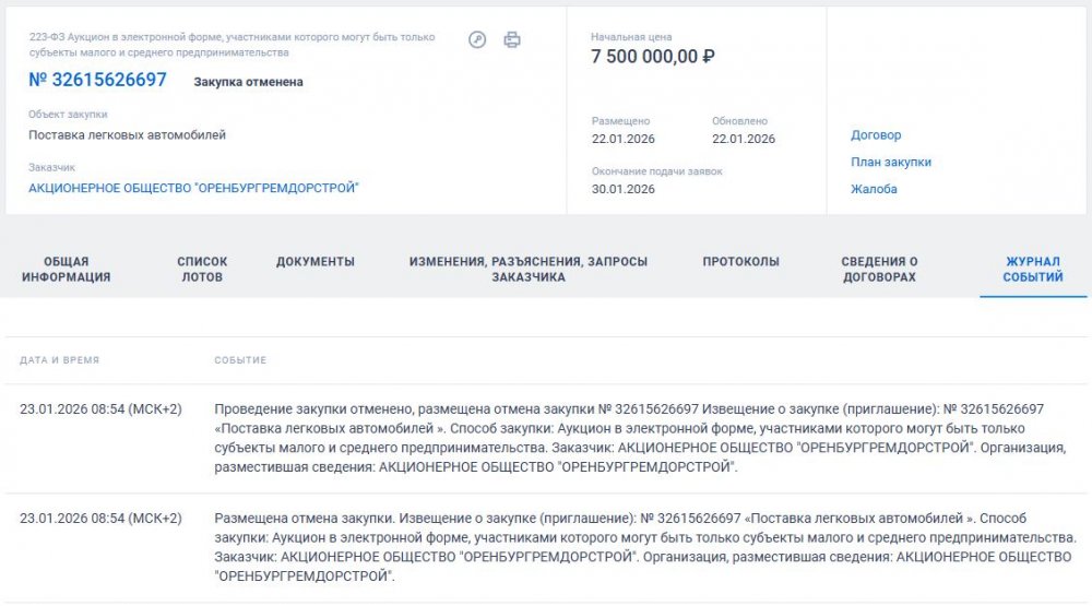 На портале госзакупок опубликована информация: акционерное общество «Оренбургремдорстрой» отменило скандальную закупку дорогого авто.