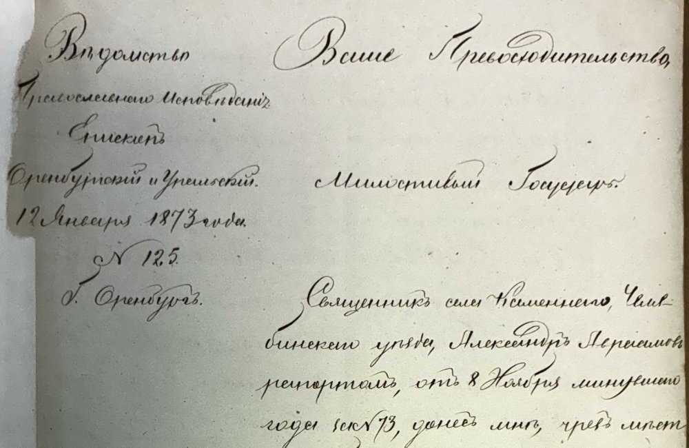 — Ваше Превосходительство, милостивый Государь. Священник села Каменнаго, Челябинскаго уезда, Александр Авраамов рапортом от 8 ноября минувшаго года за  №73 донес мне, что…