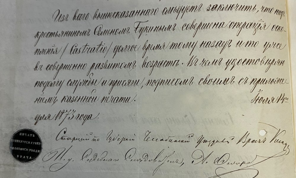 — Над крестьянином Семеном Букиным совершена операция оскопления (castratio) долгое время тому назад и то уже в совершенно зрелом возрасте. В чем удостоверяю по долгу службы и присяги, подписом своим и с приложением казенной печати.