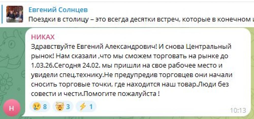 Вчера они начали обращаться к губернатору Евгению Солнцеву в его телеграм-канале: говорят, их предупреждали, что торговлю нужно прекращать с 1 марта, но сносить прилавки начали уже 24 февраля.