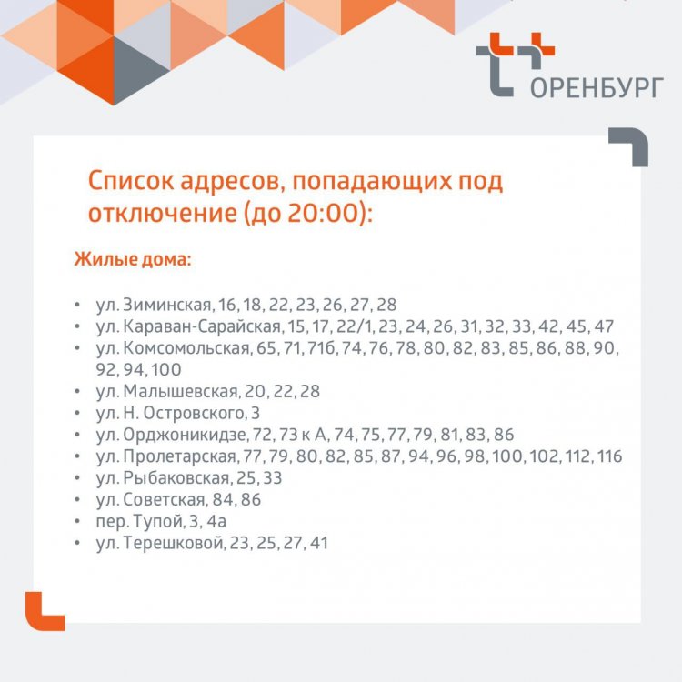 В Оренбурге более 70 домов остались без отопления. Причина — срочные работы на участке теплосети на ул. Терешковой. В «Т-Плюс» сообщили, что к 20:00 ремонт планируют завершить. Точные адреса домов, оставшихся временно без тепла, смотрите на фото.