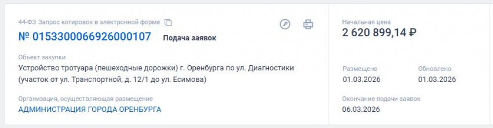 Администрация Оренбурга ищет подрядчика, который построит тротуар для пешеходов на улице Диагностики — напротив здания областной госавтоинспекции. За работы администрация готова заплатить до 2,6 миллионов рублей.