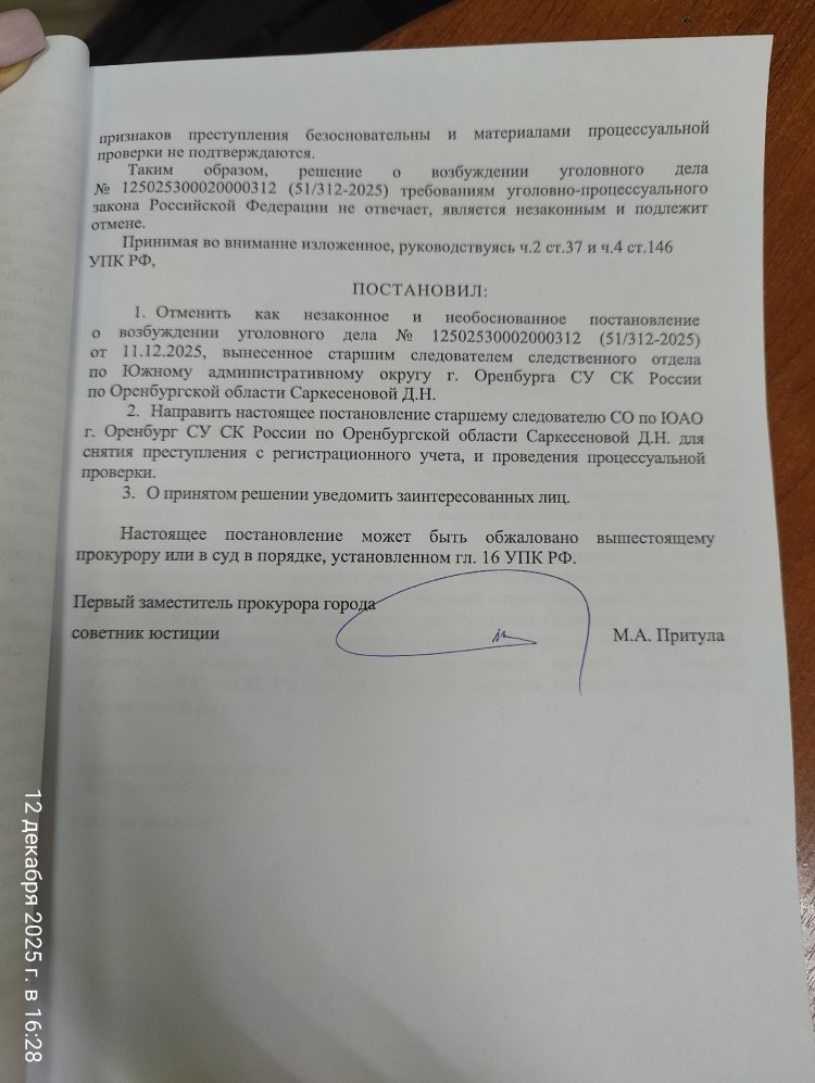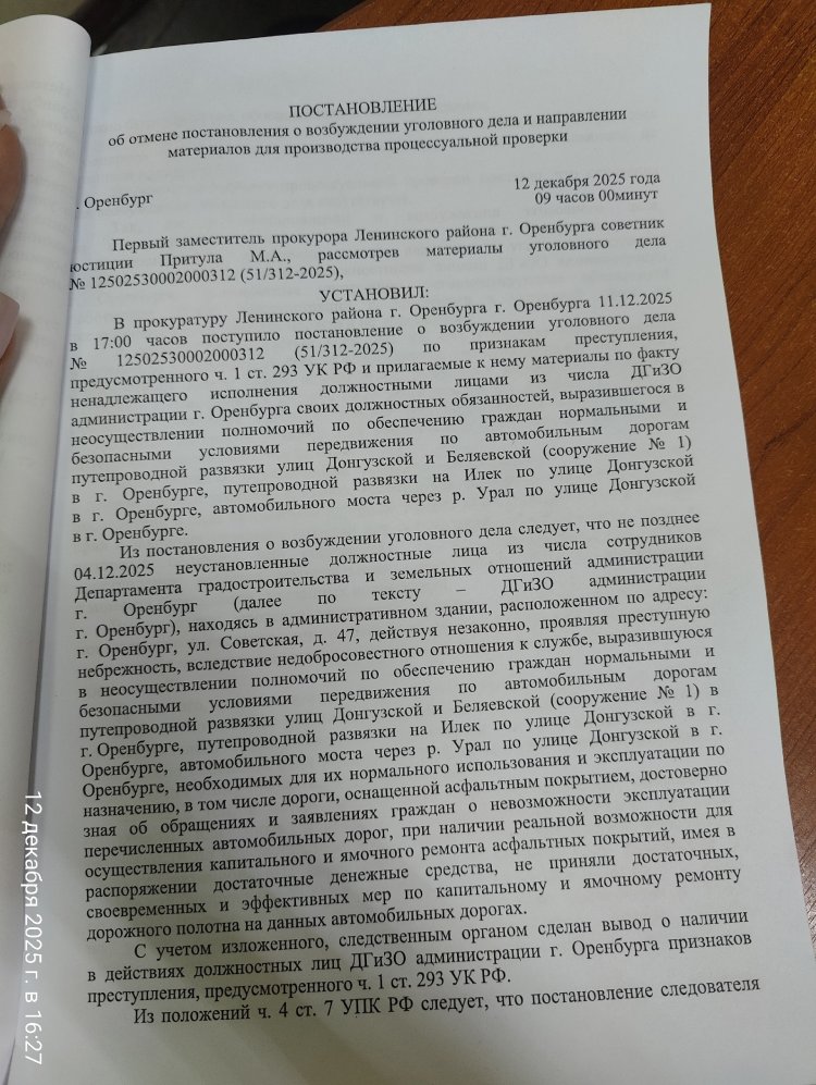 Следуя сложившейся традиции, прокуратура Ленинского района города Оренбурга отменила постановление о возбуждении уголовного дела. Потому как в данном случае неисполнение или ненадлежащее исполнение должностным лицом своих обязанностей (по ремонту моста) вследствие недобросовестного или небрежного отношения к ним, не повлекло причинения крупного ущерба (в размере 1,5 млн рублей).