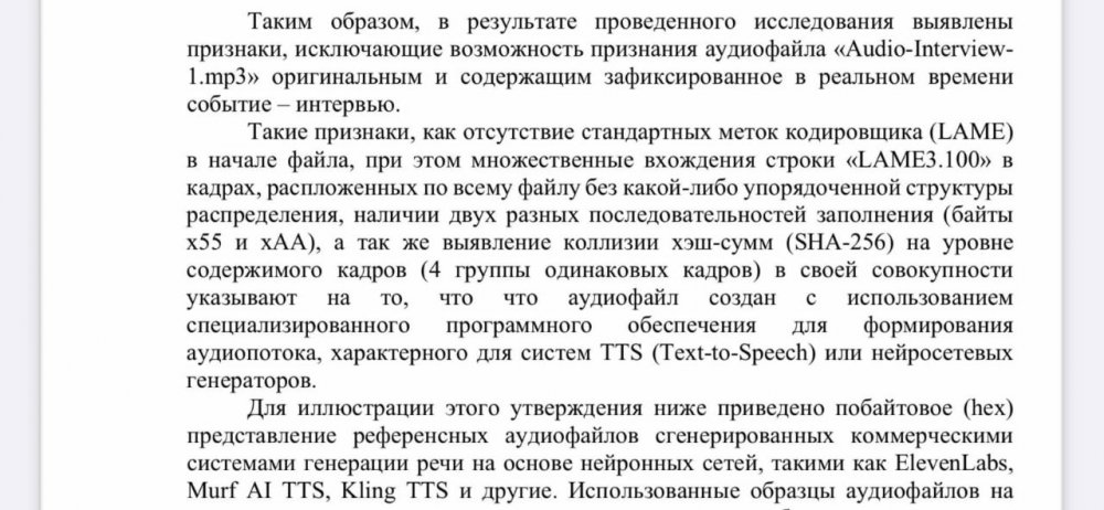 «Недавно завершившаяся фоноскопическая экспертиза, материалы которой предоставил Сергей Шевцов, показала, что приписываемое Шевцову* аудиозаявление, опубликованное в издании «Eureporter», «не является продуктом речевого аппарата человека» и полностью сгенерировано нейросетью. В указанном западном издании предусмотрена возможность размещения «гостевых публикаций» за плату, и злоумышленники этим воспользовались. По мнению Шевцовых, целью мошенников было нанести вред репутации плёсского предпринимателя и ухудшить отношение к нему со стороны госструктур. (Ниже сканы из заключения экспертизы.)