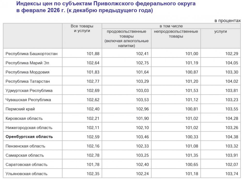 — Среди субъектов Приволжского федерального округа минимальное значение индекса потребительских цен отмечено в Саратовской области (101,78%), максимальное – в Самарской области (102,78%). Оренбургская область по этому показателю занимает девятое место (102,59%).