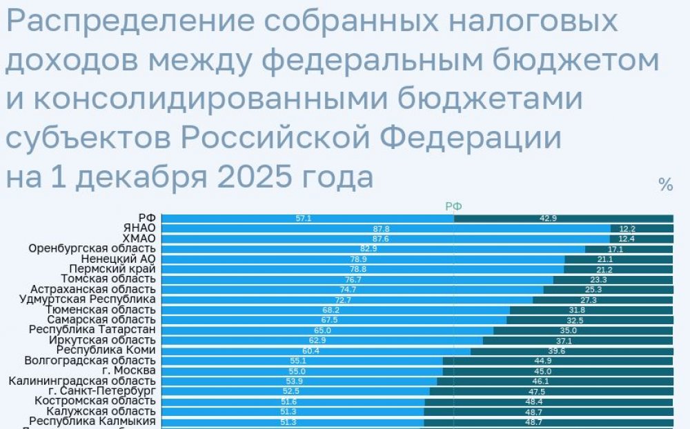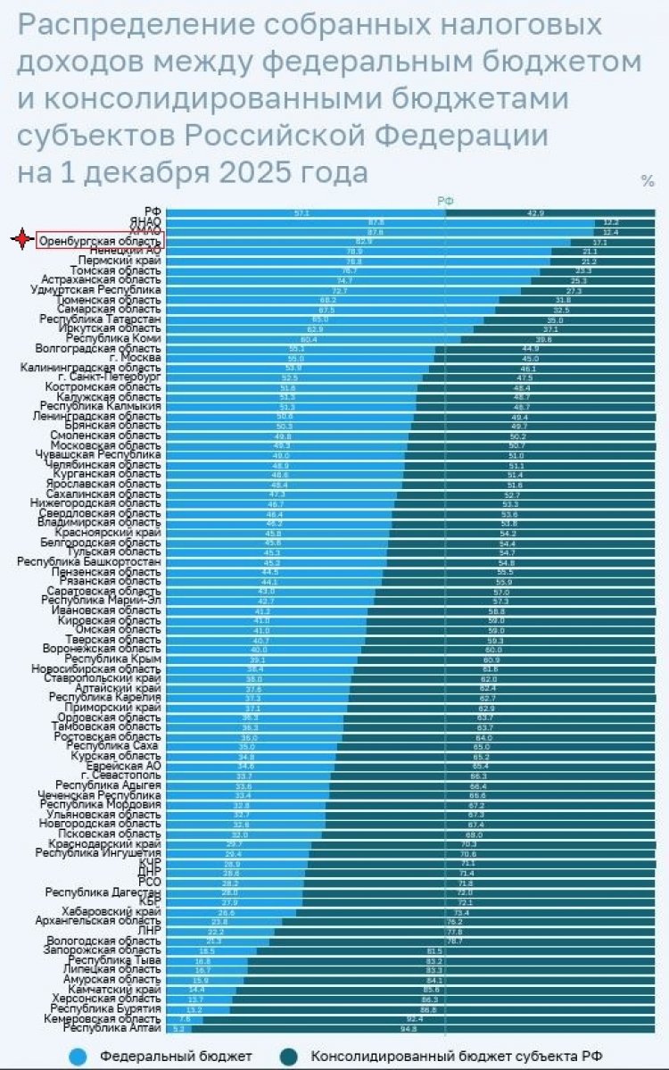 Счетная палата России опубликовала официальный доклад об исполнении бюджета 2025 года. В нем, среди всего прочего, указывается, какую долю полученных налоговых доходов разные регионы оставили себе, а какую отправили в столицу, в общий котел. Оренбуржье оказалось одним из самых щедрых: в Москву мы передали 82,9% всех полученных денег, оставив на собственные нужды лишь 17,1%.