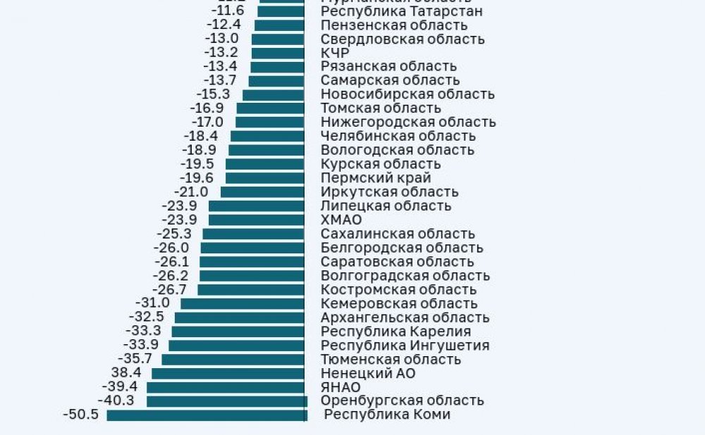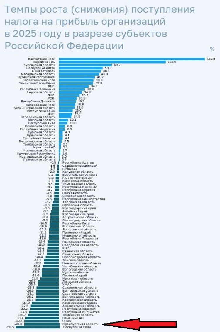 В том же докладе приводятся другие цифры: по темпам роста налога на прибыль Оренбургская область тоже в лидерах рейтинга, но — с конца! Да-да, почетное второе место, падение — целых 40,3%! Хуже нас в этом плане приходится только Республике Коми, там вообще минус 50,5%...