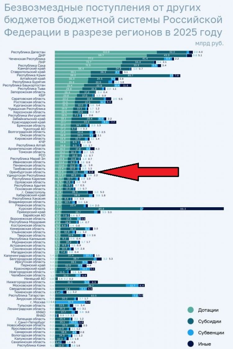 Может быть, мы отправляем в Москву деньги, чтобы они возвращались к нам в виде субсидий, субвенций и прочих безвозмездных поступлений? Безусловно, они возвращаются, но… Вот на графике указан объем этих поступлений, Оренбуржье выделено стрелочкой.