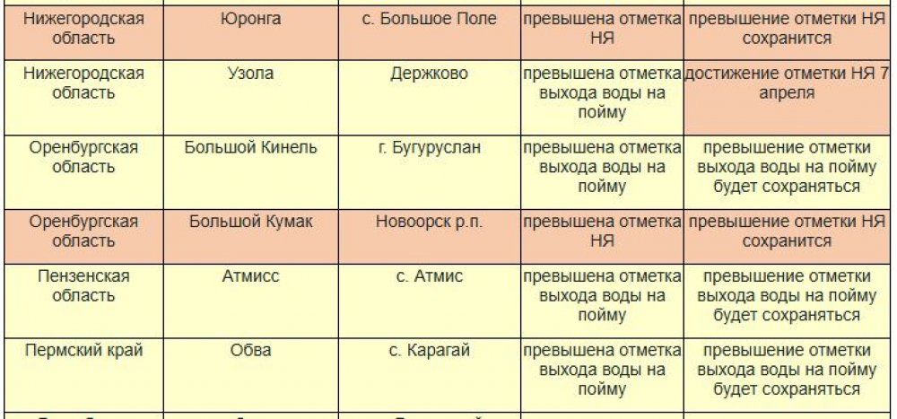 Указано, что на реке Большой Кинель в городе Бугуруслан «превышена отметка выхода воды на пойму». В реке Большой Кумак на территории поселка Новоорск «превышена отметка НЯ [неблагоприятные явления].